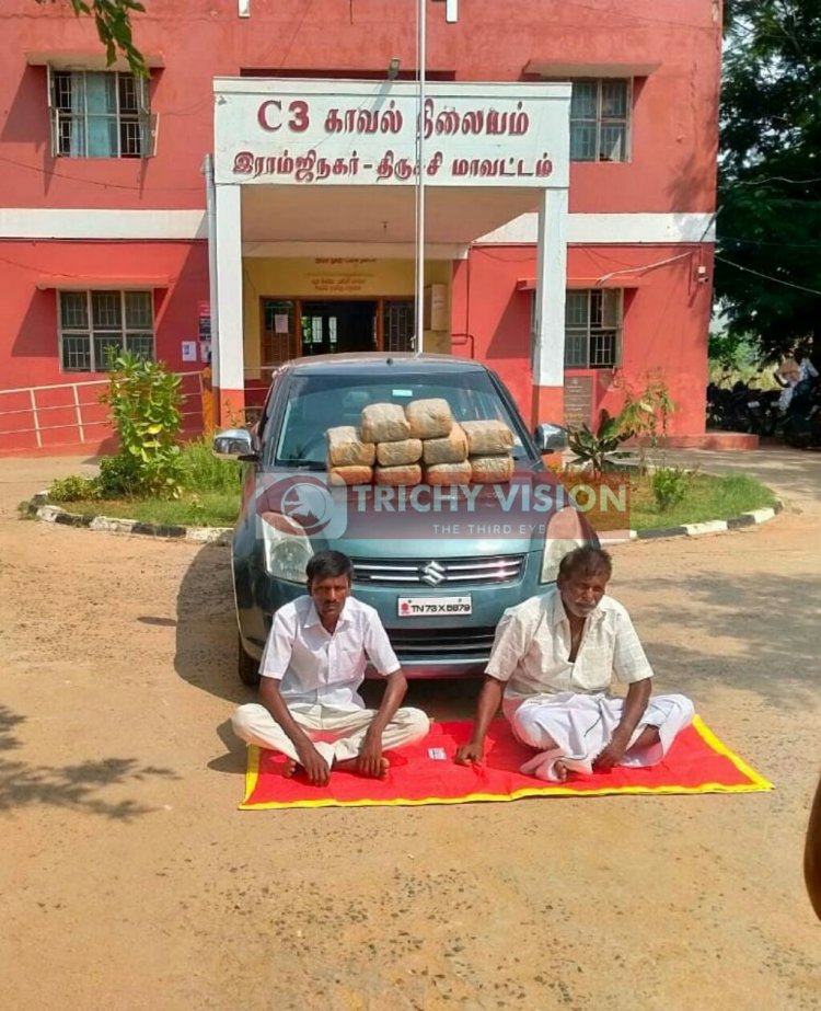 திருச்சி ராம்ஜி நகர் அருகே காவல்துறையினர் வாகன சோதனை நடத்தினர். அப்போது வெளிமாவட்ட பதிவு எண் கொண்ட காரை சோதனை செய்த போது 20 கிலோ கஞ்சாவை கடத்தி வந்தது தெரியவந்தது. இதனையடுத்து போலீசார் காரில் வந்த இருவரைிடம் நடத்தியதில் திருப்பத்தூர் அண்ணாநகர் பொம்மி குப்பத்தை சேர்ந்த சேர்ந்த மாது (65), முருகன் (43) என்பது தெரியவந்தது. பின்னர் இருவரையும் அதிரடியாக கைது செய்த போலீசார் தொடர்ந்து விசாரணை நடத்தி வருகின்றனர்.