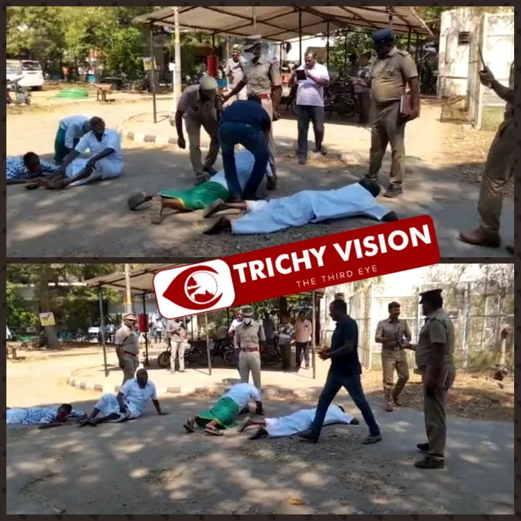 அப்போது இரண்டு விவசாயிகள் கன்டோன்மென்ட் காவல் உதவி ஆணையர் மணிகண்டன் மற்றும் ஆய்வாளர் கோசல்ராம் காலில் விழுந்தார்கள் . ஒரு விவசாயி காவல் ஆய்வாளர் காலில் விழுந்தபோது அவர் பின்னோக்கி சென்றார். இன்னொரு விவசாயி காவல் உதவி ஆணையர் மணிகண்டன் காலை பிடித்து கொண்டு சிறிது நேரம் தரையில் படுத்து இருந்தார்.போலீஸ்சார் அவரை எழுப்ப முயன்றனர் ஆனால் உதவி ஆணையர் அசராமல் அதே இடத்தில் நின்றார்.