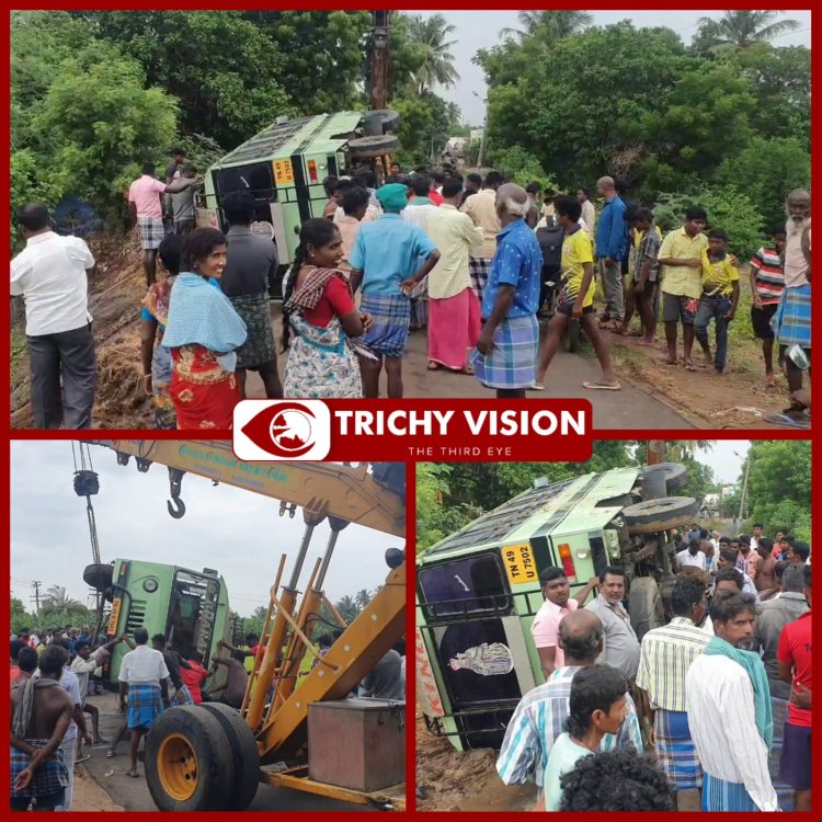 அருகில் உள்ள நெல் பயிரிட்டுள்ள வயலில் வேன் நிலை தடுமாறி கவிழ்ந்தது. இதில் வேனில் பயணம் செய்த வேன் உதவியாளர் அகிலா 5 ம் வகுப்பு மாணவி சன்மதி (10) ஆகிய இருவரும் காயங்களுடன் மீட்கப்பட்டு லால்குடி அரசு மருத்துவமனையில் அனுமதிக்பட்டு சிகிச்சைப் பெற்று வருகின்றனர். மீதமுள்ள பள்ளி குழந்தைகள் நல்வாய்ப்பாக காயங்களின்றி உயிர் தப்பினர்.