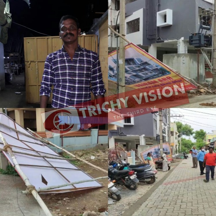 கீழே கிடந்த பதாகையினை கட்டிட வேலை செய்யும் தொழிலாளர்கள் தூக்கியபோது காற்றின் வேகத்தில் அருகில் இருந்த இபி டிரான்ஸ்பர்மில் சாய்ந்த்து. இதில் மண்ணச்சநல்லூர் அருகே சென்னகரை பகுதியைச் சேர்ந்த பழனிவேல் மகன் சேட்டு (36) என்பவரும் லால்குடி திருமங்கலம் பகுதியை சேர்ந்த ராஜமாணிக்கம் மகன் செல்லதுரை (40) என்பவரும் உயிரிழந்தனர்.