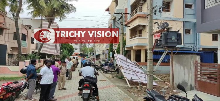 இந்த அடுக்குமாடி குடியிருப்பு வீடுகளை விற்பனை செய்வதற்காக அப்பகுதியில் உள்ள மின்சார ட்ரான்ஸ்பாரம் அருகே விளம்பர பதாதகையினை வைத்துள்ளனர். இரவு டோல்கேட் பகுதியில் பெய்த கடும் மழையினால் இந்த விளம்பரப் பதாதை தரையின் கீழே விழுந்து கிடந்தது.