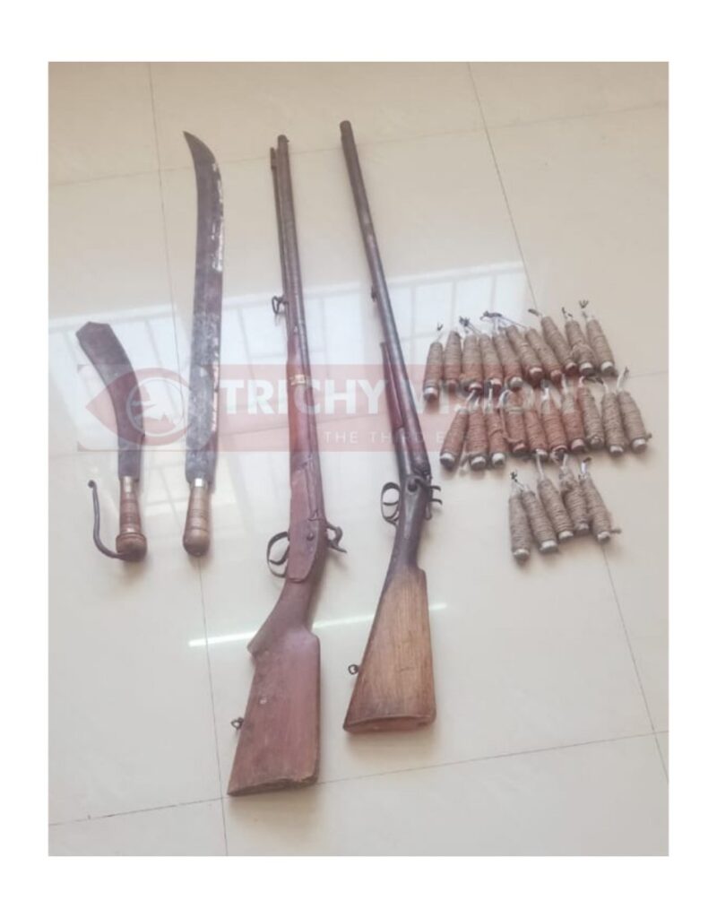 பின்னர். மேற்படி நபர்களை கைதுக்கான காரணம் கூறி, கைது செய்து மேற்படி காருடன் பெட்டவாய்த்தலை காவல் நிலையத்திற்கு அழைத்து வந்து காரை சோதனை செய்து பார்த்த போது அதில் நாட்டு துப்பாக்கிகள் -2, வீச்சரிவாள்-2, சணல் வெடிகள் 25 ஆகியவை காரில் இருந்து கைப்பற்றப்பட்டு, 104/24, U/s 296(b), 132, 351(3) BNS r/w 3 of TNPPDL Act & 25(1)(a) of Arms Act & 4, 5 of Explosives Act-6ör வழக்கு பதிவு செய்யப்பட்டு. குமுளி ராஜ்குமார் மற்றும் இனுங்கூர் பாலு (எ) பாலசுப்பிரமணியன் ஆகியோரை நீதிமன்ற காவலுக்கு அனுப்பப்பட்டது என்று திருச்சி மாவட்ட காவல்துறை வெளியிட்டுள்ள செய்தி குறிப்பில் தெரிவிக்கப்பட்டுள்ளது.
