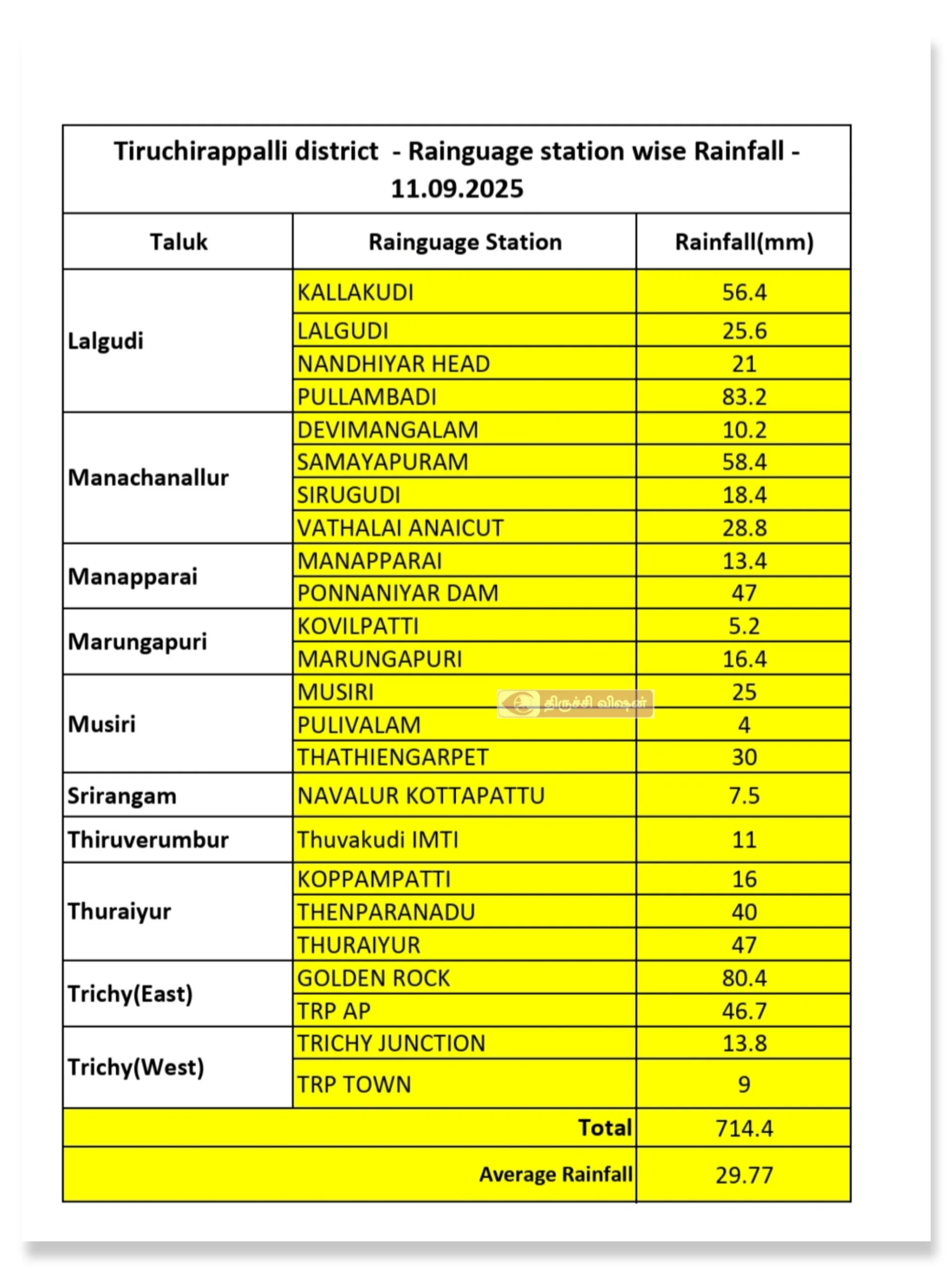 இன்று (11.09.2025) காலை நிலவரப்படி திருச்சி மாவட்டத்தில் 714.4 மிமீ மழை பதிவானது.