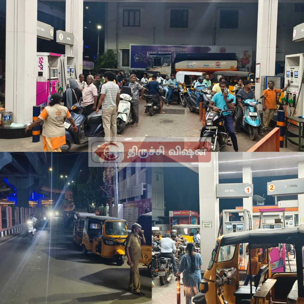 பொதுமக்களின் கூட்டம் ஆட்டோ டிரைவர்களின் கூட்டமும் அதிகரித்து உள்ளது. நீண்ட வரிசையில் பாலத்தை சுற்றி ஆட்டோக்கள் நிற்பது பொதுமக்களிடையே பெரும் பீதியை ஏற்படுத்தியுள்ளது. பொதுமக்கள் பீதி அடைய வேண்டாம் பெட்ரோல் டீசல் உள்ளதாக பெட்ரோல் டீசல் கேஸ் எல்லாமே இருக்கு மக்கள் அதிக அளவில் எரிபொருளை நிரப்பி வைத்துக் கொள்ள வேண்டாம் என கேட்டுக் கொண்டுள்ளனர். அதையும் தாண்டி பொதுமக்கள் பயத்தில் பெட்ரோல் டீசல் விலை கார் இருசக்கர வாகனங்கள் நிரப்பியும் கைகள் வாங்கி செல்லும் காட்சிகளும் அரங்கேறி வருகிறது. திருச்சி மாநகரில் அரிஸ்டோ பாலத்தின் கீழே உள்ள பங்கு 24 மணி நேரம் செயல்படும் என்பதால் பொதுமக்கள் நீண்ட வரிசையில் காத்திருந்து எரிபொருளை நிரப்புகின்றனர்.