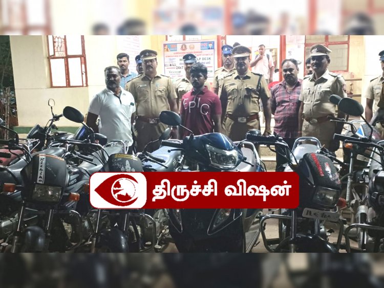 திருச்சி மாவட்டம் மணப்பாறை மற்றும் சுற்றுவட்டார பகுதிகளில் இருச்சக்கர வாகனங்களை திருடி வந்த ஆரியம்பட்டி வேல்முருகனை  வாகன சோதனையில் கைது போலீஸார் அவனிடமிருந்து 10 இருச்சக்கர வாகனங்களை பறிமுதல் செய்துள்ளனர். மணப்பாறையில் கடந்த சில மாதங்களாகவே இருச்சக்கர வாகனங்கள் தொடர்ந்து திருடப்பட்டு வருகிறது. இதுகுறித்து மணப்பாறை போலீஸார் புகார்களின் அடிப்படையில் விசாரணை மேற்கொண்டு வருகின்றனர்.