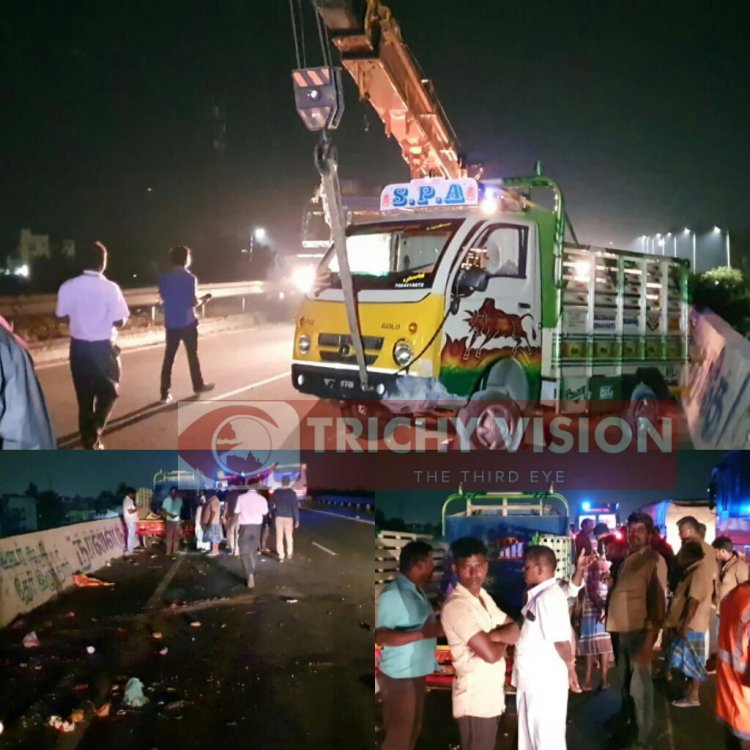 புதுக்கோட்டை மாவட்டம், குளத்தூர் அருகே கலக்குடிபட்டி பகுதியை சேர்ந்த 17 பெண்கள் தை அமாவாசை விழாவை முன்னிட்டு சமயபுரம் மாரியம்மன் கோயிலில் இரவு தரிசனம் செய்துவிட்டு டாட்டா ஏசி வாகனம் மூலம் 17 பெண்களும் வேனில் சென்னை திருச்சி தேசிய நெடுஞ்சாலை வழியாக புதுக்கோட்டை நோக்கி சென்றனர். சமயபுரம் அருகே கூத்தூர் மேம்பாலம் வழியாக வேன் சென்ற போது சென்னையில் இருந்து திருச்சி நோக்கி சென்ற கார் வேகமாக வந்து பக்தர்கள் சென்ற டாட்டா ஏசி பின்னால் கடுமையாக மோதியது.