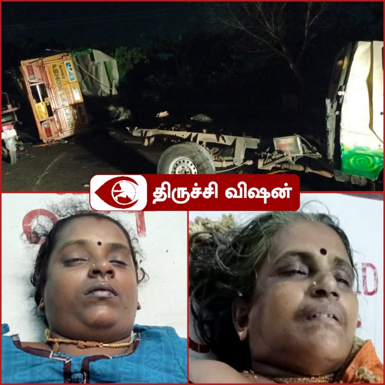 திருச்சி மாவட்டம் திருவானைக்காவல் அருகே கல்லணை சாலை பனையபுரம் கிராமத்தில் உள்ள பேருந்து நிறுத்தத்தில் டாடா ஏஸ் வாகனத்தின் மீது மணல் ஏற்றி வந்த லாரி மோதி விபத்தில் டாடா ஏஸ் வாகனத்தில் சென்ற 2 பெண்கள் சம்பவ இடத்திலேயே உயிரிழந்தனர். மேலும் 9 பேர் படுகாயமடைந்தனர்.