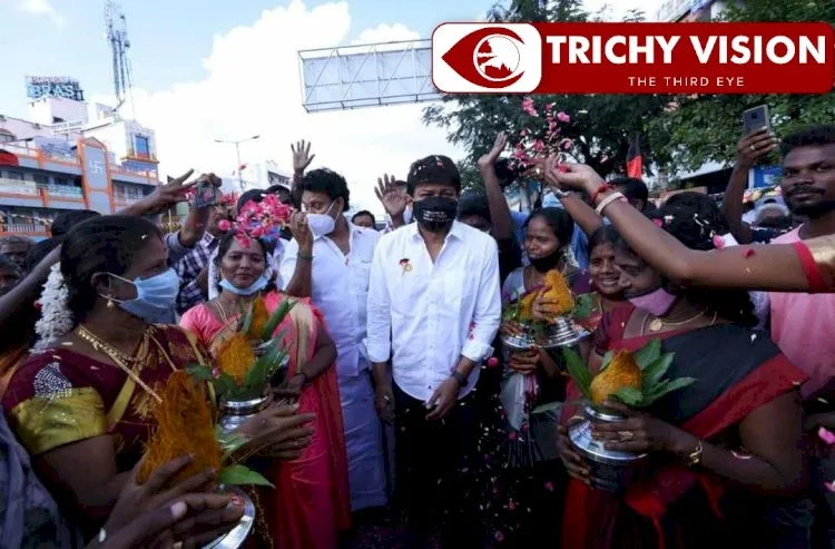 மேல சிந்தாமணி பகுதியில் திருச்சி தி.மு.க தெற்கு மாவட்டம் சார்பில் அவருக்கு கும்ப மரியாதையுடன் குதிரைகளுடன் உற்சாக வரவேற்பு அளிக்கப்பட்டது.பெண்கள் மலர் தூவி அவரை வரவேற்றனர்.தொடர்ந்து அப்பகுதியில் தி.மு.க வின் கொடியை ஏற்றினார்.