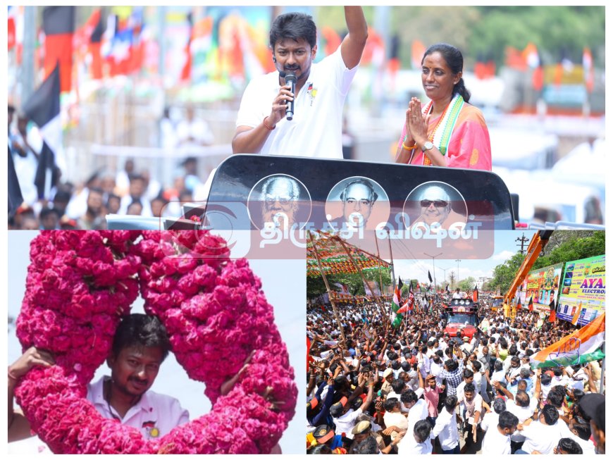 திமுக தலைமையிலான இந்திய கூட்டணியின் சார்பாக காங்கிரஸ் கட்சியின் கரூர் பாராளுமன்றத் தொகுதியின் வேட்பாளர் ஜோதிமணி அவர்களுக்கு ஆதரவாக மணப்பாறை பேருந்து நிலையம் பெரியார் சிலை அருகில் மாநில இளைஞரணி செயலாளர் விளையாட்டு மேம்பாட்டுத்துறை அமைச்சர் உதயநிதி ஸ்டாலின், கைச்சின்னத்திற்கு வாக்குகள் கேட்டு தீவிர வாக்கு சேகரிப்பில் ஈடுபட்டார். உடன் தமிழக பள்ளி கல்வித்துறை அமைச்சர் தெற்கு மாவட்ட கழக செயலாளர் அன்பில் மகேஸ் பொய்யாமொழி உடன் இருந்தார்.