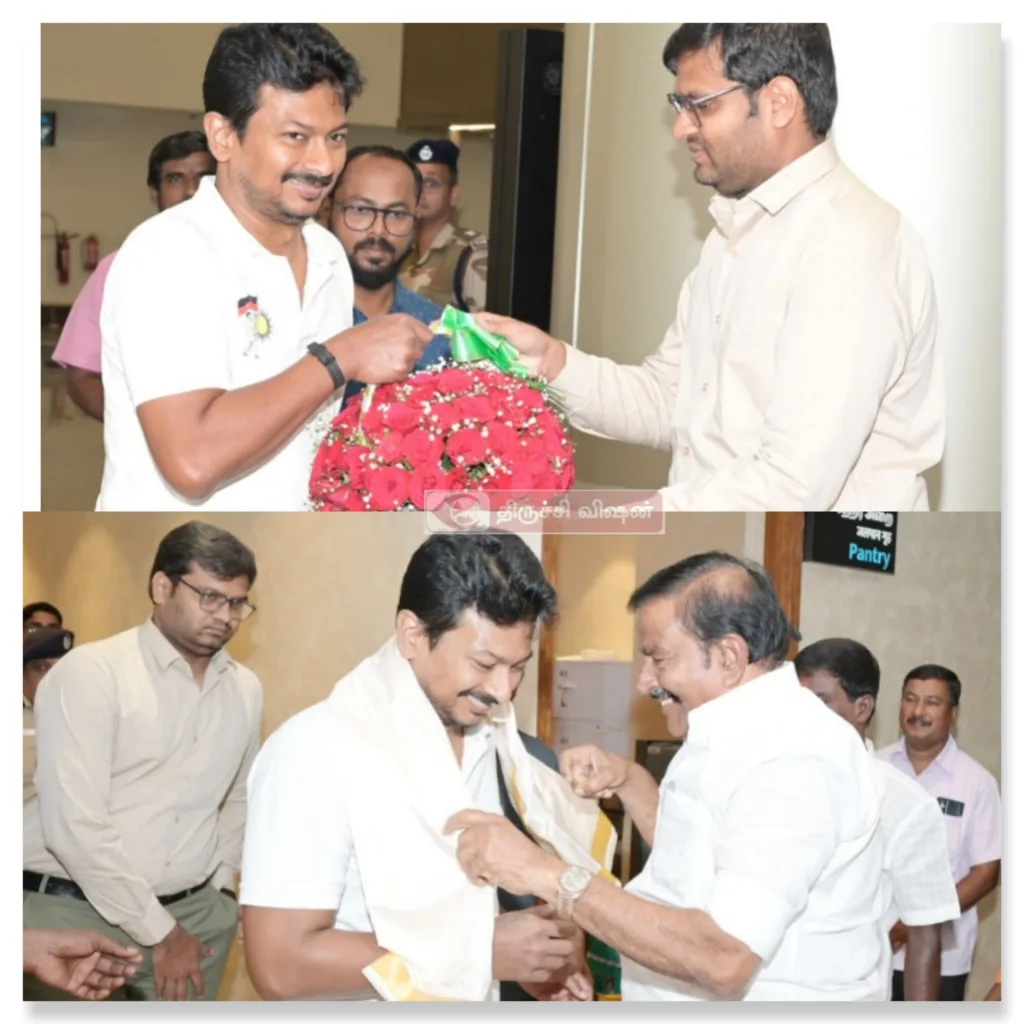 முன்னதாக திருச்சி விமான நிலையத்தில் நகராட்சி நிர்வாகத் துறை அமைச்சர் நேரு, திருச்சி மாவட்ட ஆட்சியர் சரவணன் உள்ளிட்டோர் தமிழ்நாடு துணை முதலமைச்சர் உதயநிதி ஸ்டாலினை பூங்கொத்து கொடுத்து வரவேற்றனர்.