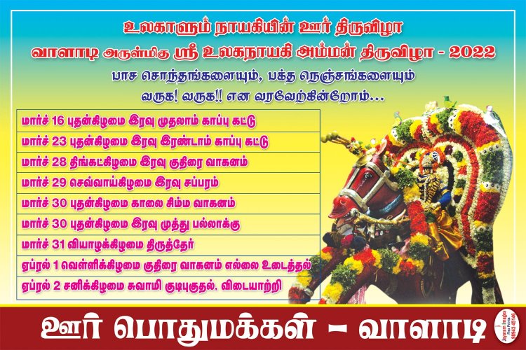 இவ்வாண்டு பங்குனி திருவிழா 16.3 2022 அன்று முதல் காப்புகட்டுடன் தொடங்குகிறது. 23.03.2022 அன்று இரண்டாம் காப்புக்கட்டு நடைபெறும் 28.3.2022 அன்று குதிரை வாகனம் 29.03.2022 அன்று சப்பரம், 30.03.2022 பகலில் சிம்ம வாகனம் இரவு பல்லக்கு. 31.03.2022 அன்று தேர் திருவிழா மிக விமரிசையாகக் கொண்டாட பெறும். 01.04.2022 அன்று அம்மன் குடிபுகுதல் என்ற திருவிழா நடைபெறும். மறு நாள் விடையாற்றி வைப்பதுடன் திருவிழா இனிதே நிறைவு பெறும். திருச்சி அரியலூர் நெடுஞ்சாலையில் திருச்சியில் இருந்து 12 கிலோமீட்டர் தொலைவில் உள்ளது.வாளாடி கிராமம். திருச்சி சத்திரம் பேருந்து நிலையத்தில் இருந்து அடிக்கடி பேருந்து வசதி உண்டு.