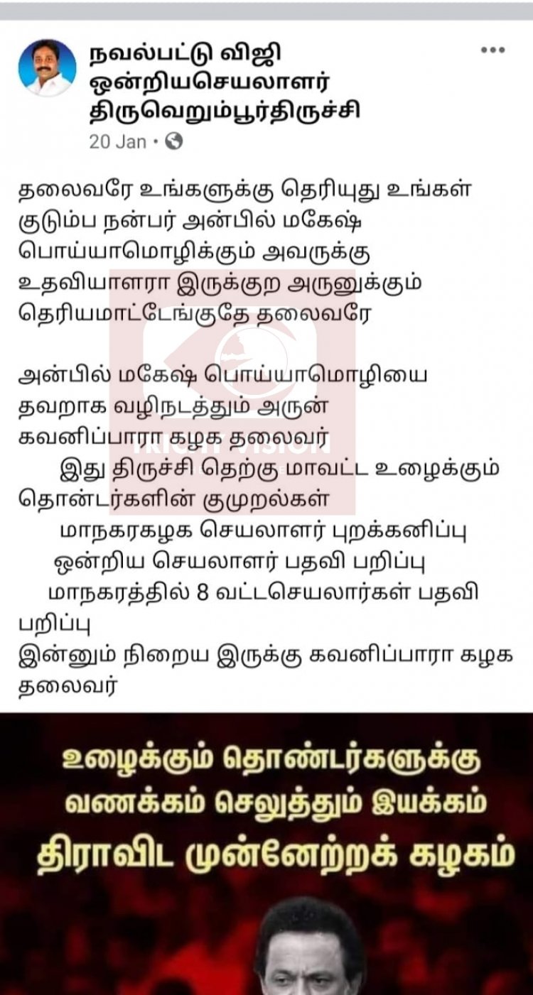 திருச்சி தெற்கு மாவட்ட திமுக மாவட்ட செயலாளரும் திருவெறும்பூர் சட்டமன்ற உறுப்பினருமான அன்பில் மகேஷ் பொய்யாமொழி. இவரை விமர்சித்து, திமுகவின் திருவரம்பூர் ஒன்றிய செயலாளர் நவல்பட்டு விஜி தன்னுடைய முகநூல் பக்கத்தில் தகாத வார்த்தைகளாலும், அடிப்படையிலிருந்து கட்சிக்கு வராமல், அப்பா தாத்தா பெயரை வைத்து அரசியல் நடத்துவதாகவும், பல இடங்களில் கோடிக்கணக்கில் திமுகவின் பேரைச்சொல்லி வசூல் செய்வதாகவும் தொடர் விமர்சனங்களை முன்வைத்து முகநூலில் தொடர் பதிவுகளை வெளியிட்டு வந்தார்.