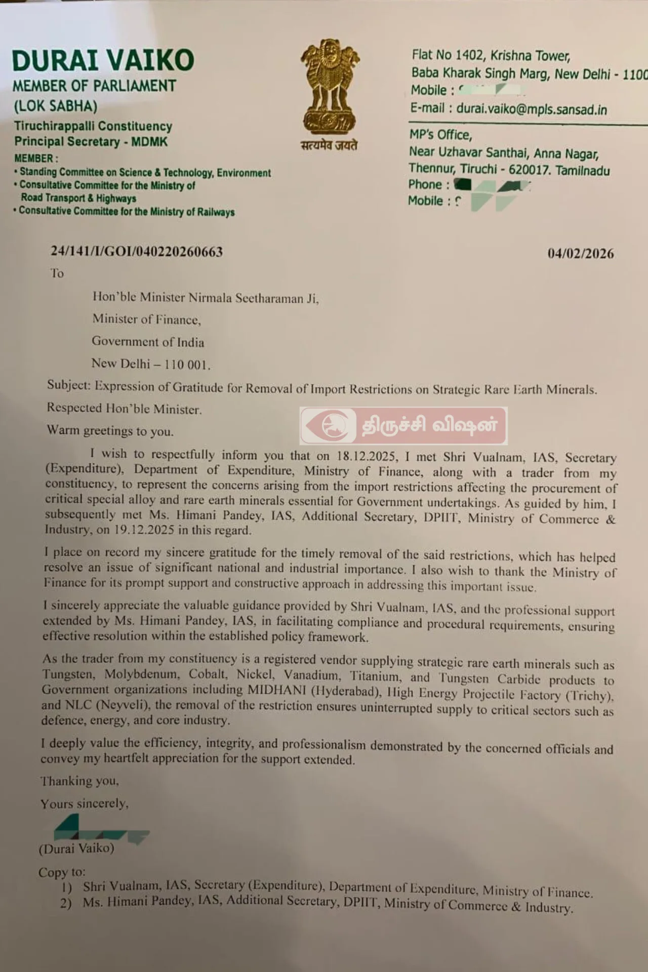 மேலும், சென்ற கூட்டத் தொடரின்போது எனது தொகுதி உட்பட நாட்டில் உள்ள பொதுத்துறை நிறுவனங்களுக்கு தேவைபடும் அரிய மண் தாதுக்கள் இறக்குமதி செய்து கொடுப்பதில் இருந்த தடைகள் குறித்து எனது கவனத்திற்கு வந்ததையடுத்து,