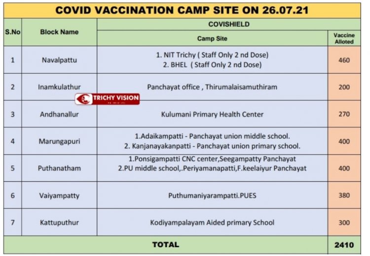 திருச்சி மாவட்டத்தின் ஊரக பகுதிகளில் நாளை (26.07.2021) தடுப்பூசி முகாம் நடைபெறும் இடங்கள்