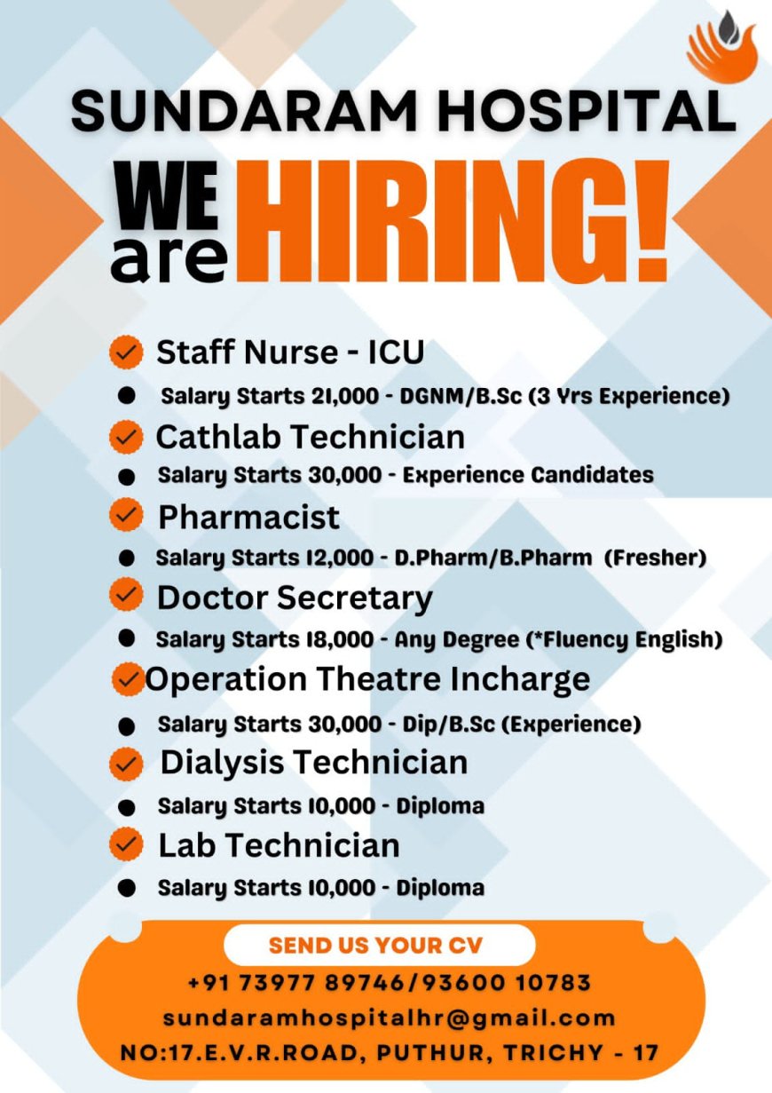 திருச்சி செயல்பட்டு வரும் பிரபல சுந்தரம் மருத்துவமனையில் கீழ்கண்ட பணியிடங்களுக்கு வேலை வாய்ப்புகள் அறிவிக்கப்பட்டுள்ளன. மேலும் விவரம் மற்றும் தொடர்புக்கு கீழே உள்ள படத்தை பார்க்கவும்.