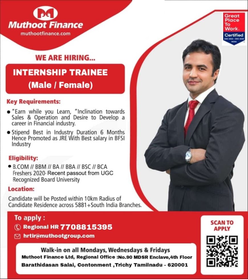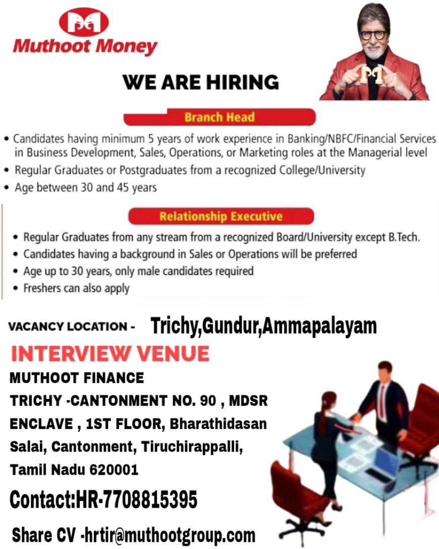 திருச்சியில் செயல்பட்டு வரும் முத்தூட் நிதி நிறுவனத்தில் பல்வேறு பணியிடங்களுக்கு வேலை வாய்ப்புகள் அறிவிக்கப்பட்டுள்ளன. மேலும் விபரம் மற்றும் தொடர்புக்கு கீழே உள்ள படத்தை பார்க்கவும்.