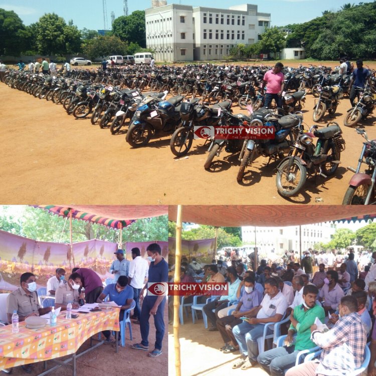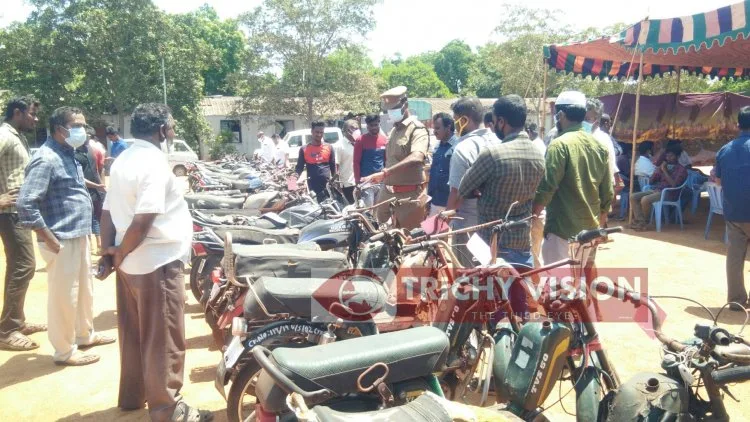 மேற்படி வாகனங்கள் அனைத்தும் உரிய அலுவலர்கள் முன்னிலையில் இன்று (30.09.2021) சுப்பிரமணியபுரத்தில் உள்ள திருச்சி மாவட்ட ஆயுதப்படை மைதானத்தில் பொது ஏலத்தில் விடப்பட்டது. ஏலம் கோர விருப்பமுள்ளவர்கள் முன்வைப்புத் தொகையாக இருசக்கர வாகனங்களுக்கு 2,000 ரூபாயும், நான்கு சக்கர வாகனங்களுக்கு 10,000 ரூபாயும் செலுத்தி ஏலம் கேட்டு வருகின்றனர்.