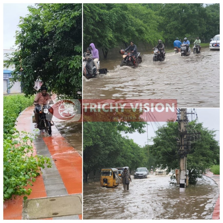 திருச்சி காஜாமலை நகர் நுகர்பொருள் வாணிப சேமிப்பு கிடங்கு அருகே சாலை முழுவதும் மழை நீர் சூழ்ந்துள்ளது. வாகன ஓட்டிகள் அச்சாலையை பயன்படுத்த முடியாமல் பெரும் சிரமத்திற்கு ஆளாகியுள்ளனர். சாலையில் பயணிக்க முடியாத நிலை உள்ளது. இதற்கு காரணம் பாதாள சாக்கடைக்காக சாலை ஓரமாக சிமெண்டினாலான சிறிய சுவர் போன்று கட்டி வைத்துள்ளதால் மழை நீர் வடிய முடியாமல் சாலை முழுவதும் தேங்கியுள்ளது.