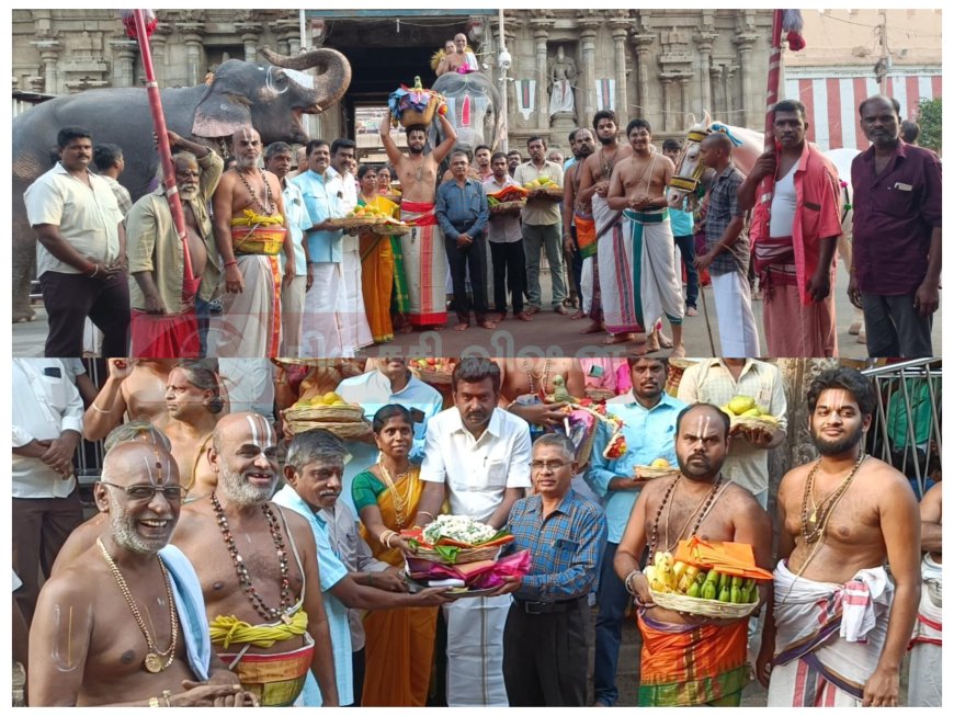 முன்னதாக நம்பெருமாளுக்கான வஸ்திரங்கள், பழங்கள் மற்றும் பூக்கள் யாவும் கருட மண்டபத்தில் இருந்து திருக்கோயில் பிரகாரங்களில் வலம்வந்து பின்னர் மூலஸ்தானம் கொண்டு செல்லப்பட்டது. பின்னர் சித்திரை திருவிழாவில் 9 ஆம் நாளான, நாளை நடைபெறும் திருத்தேரோட்டத்தின்போது ஆண்டாள் சூடிக்கொடுத்த கிளி மாலை மற்றும் வஸ்திரங்களை அணிந்து நம்பெருமாளும் தாயாரும் அணிவிக்கப்பட்டு பக்தர்களுக்கு காட்சியளிக்கிறார்.