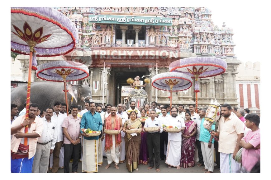 இதனை திருமலை திருப்பதி அறங்காவலர் குழு தலைவர் சியாமளா ராவ் (IAS) தலைமையில் எடுத்து வந்து ஸ்ரீரங்கம் கோவில் இணைஆணையர் மாரியப்பன், தலைமை பட்டாச்சார்யார் சுந்தர் பட்டர் மற்றும் அலுவலர்களிடம் ஒப்படைத்தனர். முன்னதாக நம்பெருமாளுக்கான வஸ்திரங்கள் கோவில் யானைகள் ஆண்டாள் மீது வைத்து கோவில் வளாகத்திலிருந்து புறப்பட்டு உள்பிரகாரங்களில் வலம் வந்து மீண்டும் கோவிலை அடைந்தனர்.