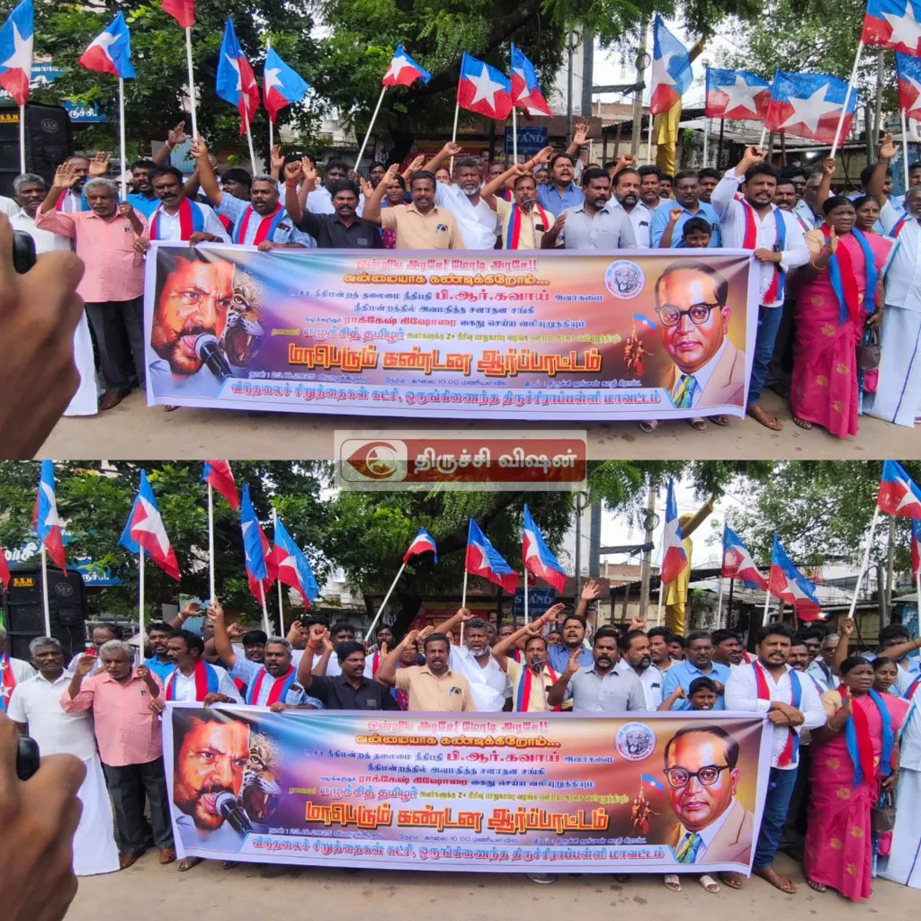 திருச்சி மாவட்ட ஒருங்கிணைந்த விடுதலை சிறுத்தைகள் கட்சியின் சார்பில் மாவட்ட செயலாளர்கள் புல்லட் லாரன்ஸ், கனியமுதன், சக்தி ஆற்றலரசு, வழக்கறிஞர் கலைச்செல்வன், குருஅன்புசெல்வன் ஆகியோர் தலைமையில் ரயில்வே ஜங்ஷன் எதிரே உள்ள காதி கிராப்ட் அருகில் கோரிக்கை வலியுறுத்தி ஆர்ப்பாட்டம் நடைபெற்றது.