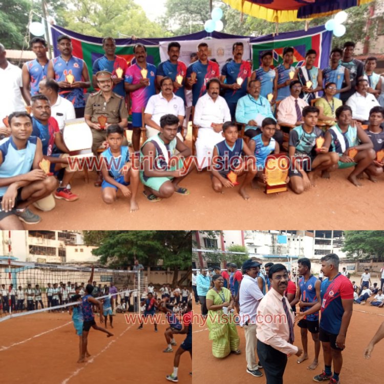 திருச்சியில் பள்ளி மாணவர்களுக்கும், ரயில்வே பாதுகாப்பு படை வீரர்களுக்கும் இடையே வாலிபால் போட்டி