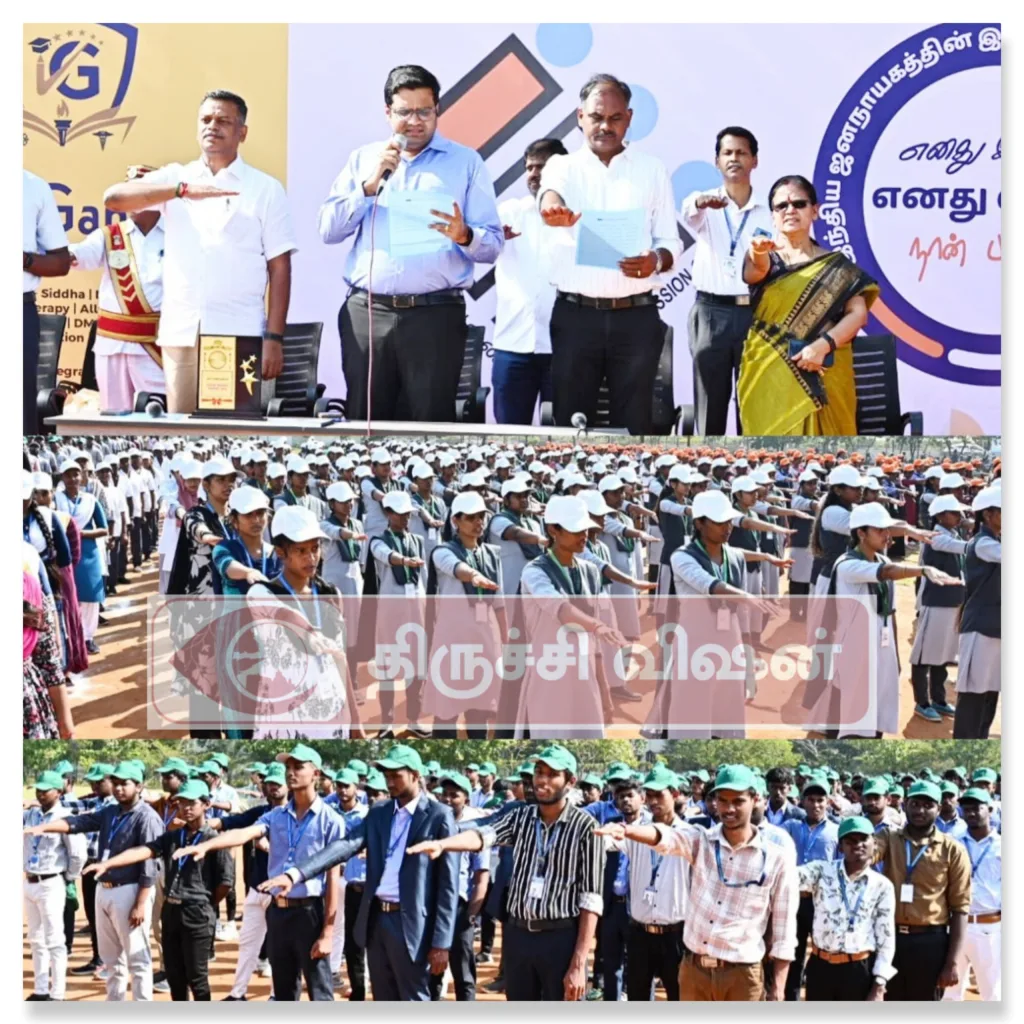 திருச்சிராப்பள்ளி இந்திரா கணேசன் கல்லூரியில் இந்திய தேர்தல் ஆணையத்தின் அறிவுறுத்தலின்படி தேசிய வாக்காளர் தினத்தை முன்னிட்டு வாக்களிப்பதன் அவசியம் குறித்து மாணவர்களிடையே விழிப்புணர்வு ஏற்படுத்தும் வகையில் வாக்காளர் விழிப்புணர்வு உறுதிமொழியினை மாவட்ட தேர்தல் அலுவலர் / மாவட்ட ஆட்சித்தலைவர் வே.சரவணன், அவர்கள் தலைமையில் தேர்தல் ஆணையத்தின் இலச்சினை வடிவில் நின்று மாணவ, மாணவிகள் இன்று (23.01.2026) உறுதிமொழி எடுத்தனர்.
