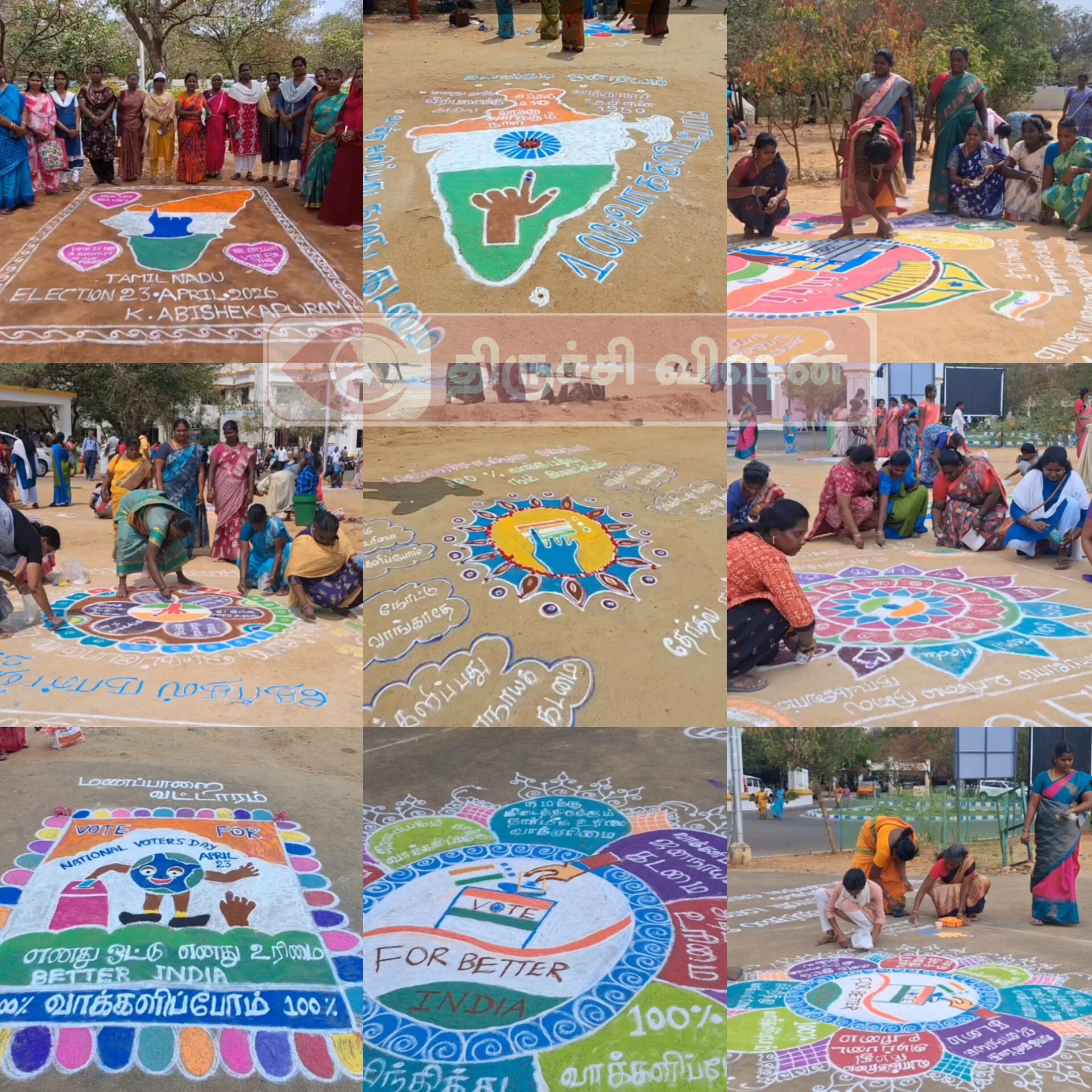 தமிழ்நாடு சட்டமன்றத் தேர்தல் வரும் எப்ரல் 23 ஆம் தேதி நடைபெற உள்ளது. இந்நிலையில் இந்திய தேர்தல் ஆணையத்தின் சார்பில், நாடு முழுவதும் வாக்களிப்பதன் அவசியம் குறித்த விழிப்புணர்வு நிகழ்ச்சிகள் நடத்தப்பட்டு வருகிறது. அதன் ஒரு பகுதியாக திருச்சி மாவட்ட ஆட்சியர் அலுவலகத்தில், ரங்கோலி கோலம் வரைந்து வாக்காளர்களுக்கு விழிப்புணர்வு ஏற்படுத்தும் நிகழ்ச்சி இன்று நடைபெற்றது.