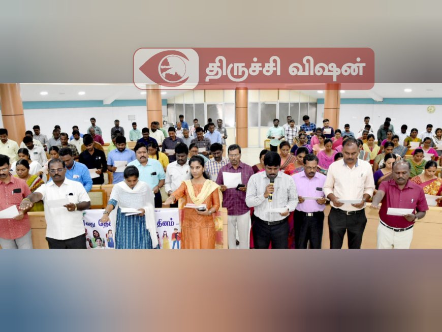 பின்னர் மாவட்ட ஆட்சித்தலைவர் அலுவலக கூட்டரங்கில் வாக்காளம் தின உறுதிமொழியினை மாவட்ட தேர்தல் அலுவலர் / மாவட்ட ஆட்சித்தலைவர் வாசிக்க அனைத்து அரசுத்துறை அலுவலர்களும் வாக்காளர் தின உறுதிமொழியினை எடுத்துக்கொண்டனர். இந்நிகழ்வுளில், மாவட்ட ஆட்சித்தலைவரின் நேர்முக உதவியாளர் (பொது) சரண்யா, மாவட்ட ஆட்சித்தலைவரின் நேர்முக உதவியாளர்(தேர்தல்) ந.சீனிவாசன், பயிற்சி ஆட்சியர் ஐஸ்வர்யா, தந்தை பெரியார் கல்லூரி, ஜமால்முகமது கலை மற்றும் அறிவியல் கல்லூரி முதல்வர்கள் மற்றும் பேராசிரியர்கள், மாணவ, மாணவிகள், அரசுத்துறை அலுவலர்கள் உள்ளிட்ட பலர் கலந்து  கொண்டனர்.
