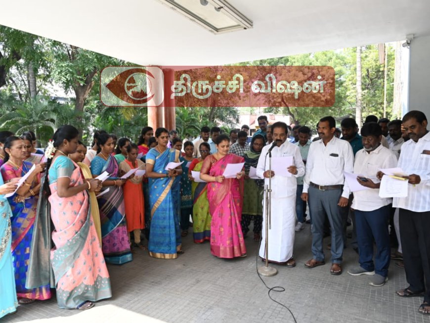 திருச்சிராப்பள்ளி மாநகராட்சியில் மாண்புமிகு மேயர் மு. அன்பழகன் அவர்கள் தலைமையில் 25.01.2024அன்று 14வதுதேசிய வாக்காளர் தினத்தை முன்னிட்டு இன்று 24.01.2024 மாநகராட்சி மைய அலுவலகத்தில் வாக்காளர்கள் தேர்தல் நடைமுறையில் பங்கேற்பதை அதிகரிக்கும் விதமாக வாக்காளர் தின உறுதிமொழியை மேயர் வாசிக்க அதனை தொடர்ந்து மாநகராட்சி அலுவலர்கள் உறுதிமொழிஎடுத்துக்கொண்டனர்.