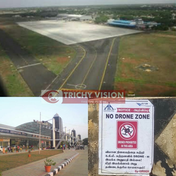 திருச்சி விமான நிலையத்தை சுற்றி 3 கிலோ மீட்டர் சுற்றளவுக்கு டிரோன் கேமரா இயக்க தடவை விதிக்கப்பட்டிருப்பது குறித்து பொதுமக்களுக்கு எச்சரிக்கை சுவரொட்டி ஒட்டப்பட்டுள்ளது. திருச்சி விமான நிலையத்தின் பாதுகாப்பு மற்றும் விரிவாக்கம் குறித்த குழு உறுப்பினர்கள் கூட்டம் கடந்த மாதம் நடைபெற்றது.