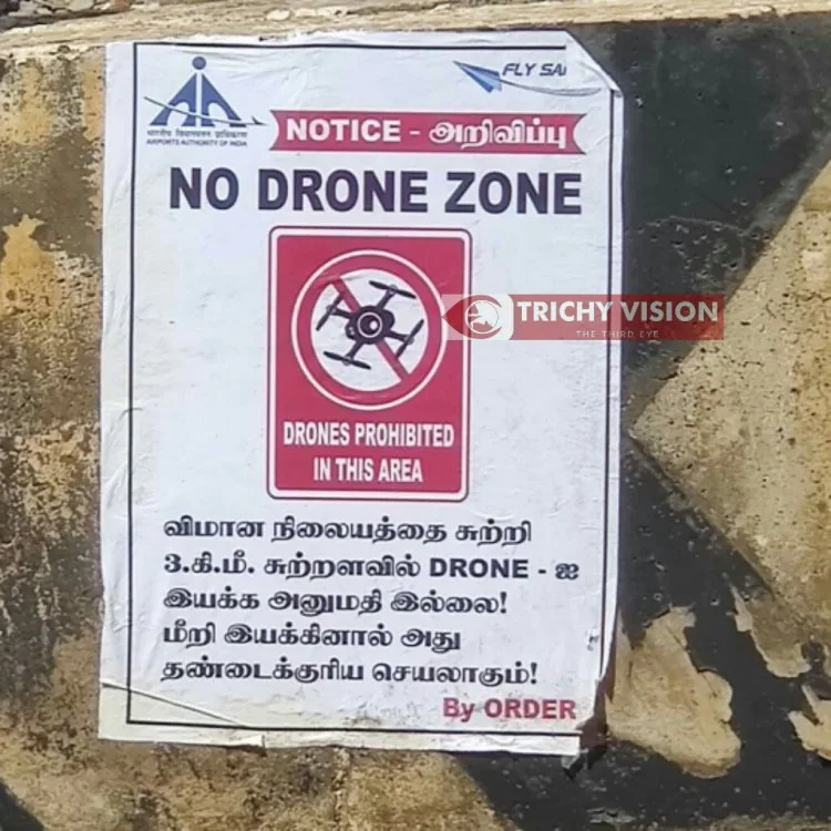 திருச்சி விமான நிலையத்தை சுற்றி டிரோன் கேமரா இயக்க தடை சாலைகளில் எச்சரிக்கை சுவரொட்டி