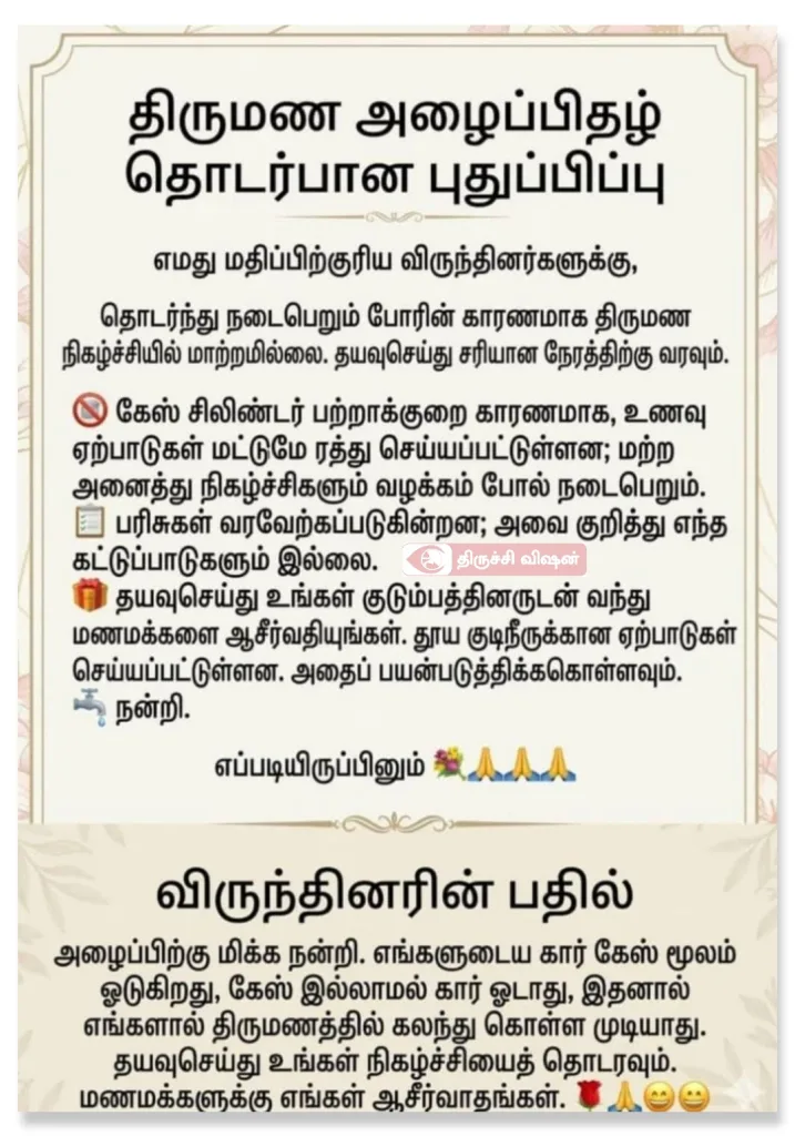 ஆனால் கேஸ் சிலிண்டர் பற்றாக்குறை காரணமாக உணவு ஏற்பாடுகள் மட்டும் ரத்து செய்யப்பட்டுள்ளது என்றும், மற்ற நிகழ்ச்சிகள் வழக்கம்போல் நடைபெறும் என்றும் குறிப்பிடப்பட்டுள்ளது. மேலும், பரிசுகள் வரவேற்கப்படுகின்றன என்றும், குடும்பத்தினருடன் வந்து மணமக்களை ஆசீர்வதிக்குமாறும் அழைப்பு விடுக்கப்பட்டுள்ளது.