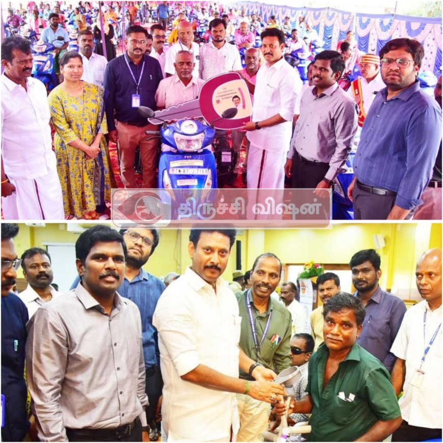 திருச்சி மாவட்ட ஆட்சியரகத்தில் இந்திய செயற்கை அவயங்கள் உற்பத்திக் கழகம் மற்றும் மாவட்ட மாற்றுத்திறனாளிகள் நலத்துறை சார்பில் நலத்திட்ட உதவிகள் வழங்கும் நிகழ்ச்சி நடைபெற்றது.இதில் இந்தியன் ஆயில் நிறுவனங்களின் சமூகப் பொறுப்பு திட்டத்தின் கீழ் திருச்சி மாவட்ட த்தைச் சார்ந்த 303 பயனாளிகளுக்கு 62 லட்சம் மதிப்பில் மோட்டார் பொருத்தப்பட்ட மூன்று சக்கர வாகனம், மடக்கு சக்கர நாற்காலி, மூன்று சக்கர சைக்கிள், ஊன்றுகோல், செல்போன், காதொழி கருவி , செயற்கை அவயங்கள் உள்ளிட்ட மாற்றுத்திறனாளி உபகரணங்ககளை அமைச்சர் K.N. நேரு மாற்றுத் திறனாளிகளுக்கு வழங்கினார்