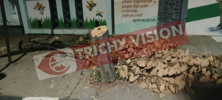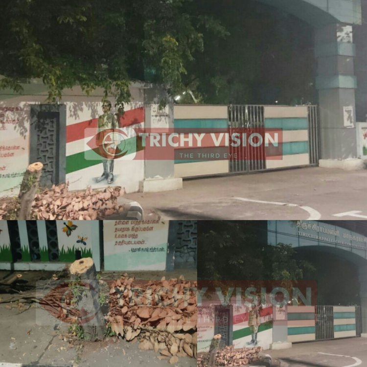 மேலும் மரங்களை வெட்டுபவர்கள் மீது சட்டரீதியாக நடவடிக்கை எடுக்கப்படுகிறது. இந்நிலையில் திருச்சி மாநகராட்சி அலுவலகத்தில் வெளியே செல்லும் வாயிலில் மரம் வெட்டப்பட்டு உள்ளது. மாநகராட்சி அலுவலகம் முன்பும், உள்புறமும் மரங்கள் நிறைந்த பசுமையாக காட்சியளித்து கொண்டிருக்கிறது.