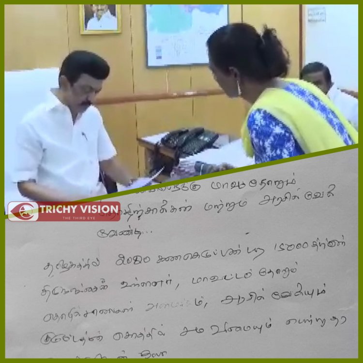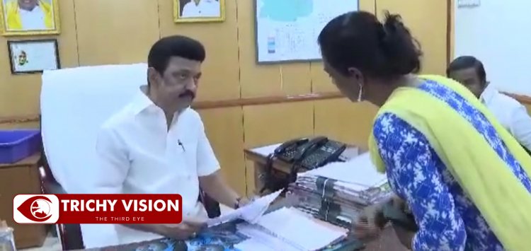 தமிழக முதல்வர் மு.க.ஸ்டாலினை திருச்சி மாநகராட்சி அலுவலகத்தில் திடீரென ஆய்வு செய்தார். அப்போது மாநகராட்சி அலுவலகத்தில் மனு கொடுக்க காத்திருந்த பொதுமக்களை அழைத்து அவர்களிடம் முதலமைச்சர் மனுக்களை பெற்று குறைகளை கேட்டறிந்தார். இதில் முதலமைச்சர் மு.க.ஸ்டாலினை சந்தித்த திருநங்கை கஜால் (SAFE Trust MD ) தமிழக திருநங்கைகளின் மேம்பாடு குறித்து மனு கொடுத்தார்.