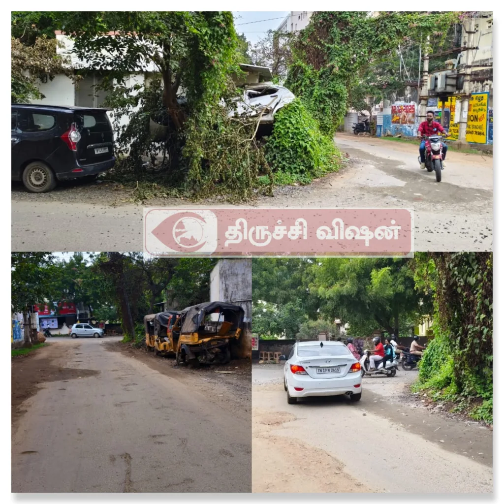 இது ஒரு புறம் இருக்க காவல் நிலையங்களில் வழக்குகள் தொடர்பாக பறிமுதல் செய்யப்பட்ட வாகனங்கள் சாலை ஓரத்தில் ஒன்றன் மேல் ஒன்றாக அடுக்கி வைக்கப்பட்டு புதர்களுக்குள் காட்சியளிக்கிறது. திருச்சி மாநகராட்சி நீதிமன்றம் பிரதான சாலையில் போக்குவரத்து நெரிசல் அதிக அளவில் ஏற்படுவதால் வாகன ஓட்டிகள் இந்த சாலையை பயன்படுத்துகின்றனர்.