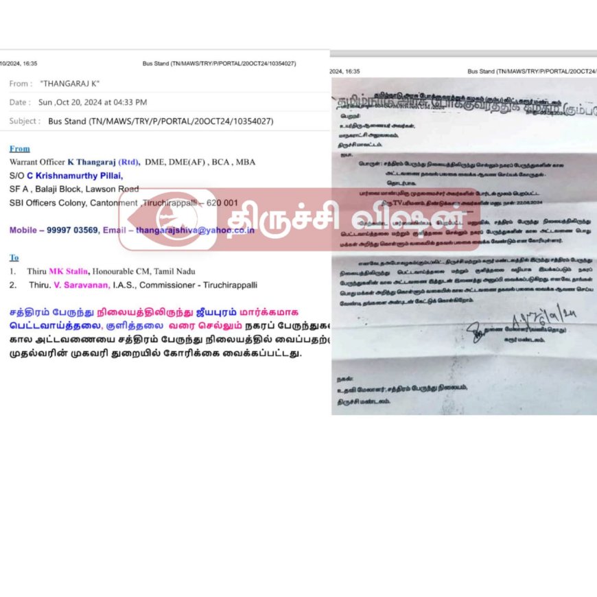 திருச்சி சத்திரம் பேருந்து நிலையத்திலிருந்து ஜீயபுரம் மற்றும் பெட்டவாய்த்தலை வழியாக குளித்தலை வரை செல்லும் நகரப் பேருந்துகளின் கால அட்டவணையை பொதுமக்களின் வசதிக்காக சத்திரம் பேருந்து நிலையத்தில் வைக்க வேண்டும் என்று தமிழக முதல்வரின் முகவரி துறையிடம் கடந்த ஆகஸ்ட் மாதம் கோரிக்கை வைக்கப்பட்டது.