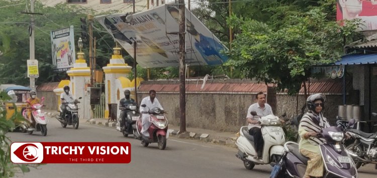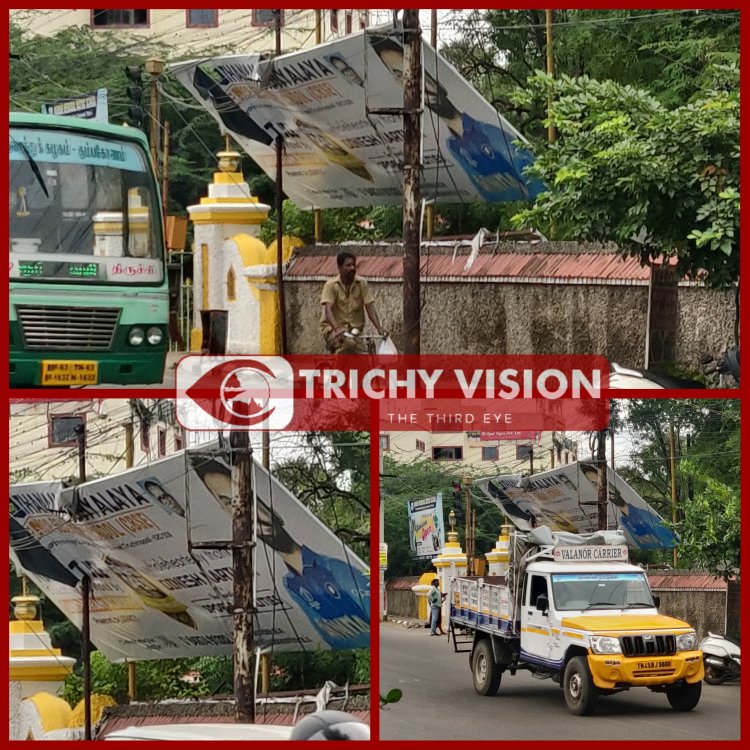 சாலையில் செல்லும் வாகன ஓட்டிகள் பெருத்த சிரமத்திற்கு ஆளாகின்றனர். இந்நிலையில் திருச்சி வெஸ்ட்ரி பள்ளி அருகே உள்ள ரவுண்டானாவில் வைக்கப்பட்டுள்ள பெரிய பிளக்ஸ் போர்டு சாய்ந்து சாலையில் விழும் நிலையில் உள்ளது.