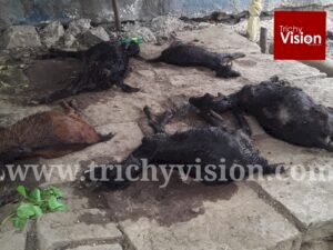 ஒன்றும் அறியாத ஐந்தறிவு ஜீவன்கள் பசிக்கு அதனை தின்றுள்ளன. குருணை மருந்து கலந்த அரிசியை சாப்பிட்ட ஐந்து நிமிடத்திற்குள் ஒவ்வொரு ஆடுகளாக மொத்தம் 6 ஆடுகள், ஒரு கன்றுக் குட்டி சுருண்டு விழுந்து இறந்து போனது. ஒரு ஆடு மட்டும் உயிர்பிழைத்தது. சம்பவம் குறித்து கங்காதரன் திருச்சி ஸ்ரீரங்கம் காவல் நிலையத்தில் புகார் அளித்ததை தொடர்ந்து காவல் துறையினர் மற்றும் கால் நடை மருத்துவர்கள் வரவழைக்கப்பட்டு உடற்கூறு ஆய்வு செய்யப்பட்டதில் குருணை மருந்து சாப்பிட்டு ஆடுகள் உயிரிழந்தது தெரியவந்தது.