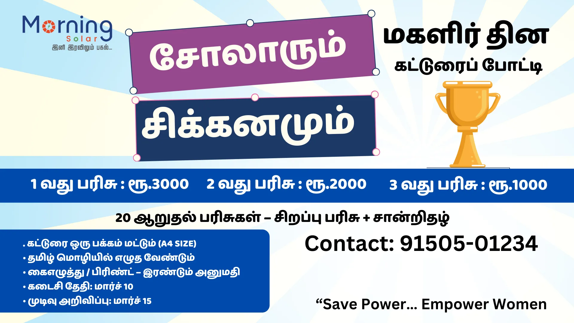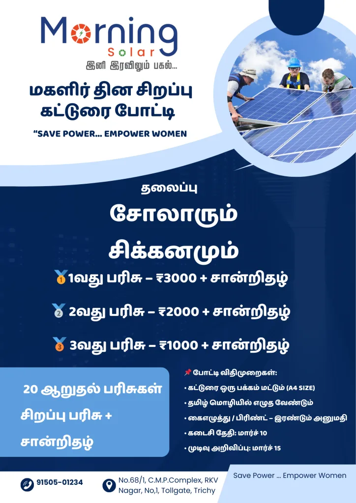 மகளிர் தினத்தை முன்னிட்டு மார்னிங் சோலார் நிறுவனம் சார்பில் “சோலாரும் சிக்கனமும்” என்ற தலைப்பில் கட்டுரை போட்டி நடத்தப்பட உள்ளது.