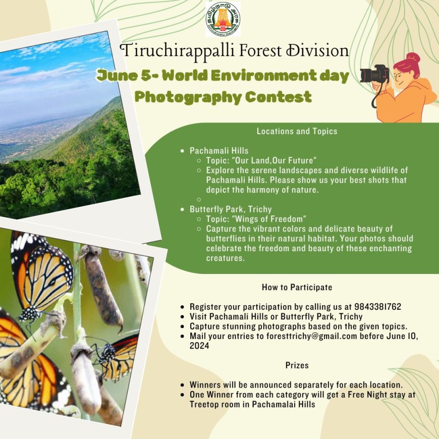 உலக சுற்றுச்சூழல் தினத்தை முன்னிட்டு உலக சுற்றுச்சூழலை பாதுகாப்பது குறித்து திருச்சி வனத்துறை சார்பில் புகைப்பட போட்டி நடைபெற உள்ளது. இப்போட்டி குறித்த விவரங்களுக்கு கீழ் உள்ள படத்தை காணவும்.