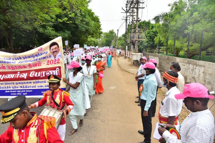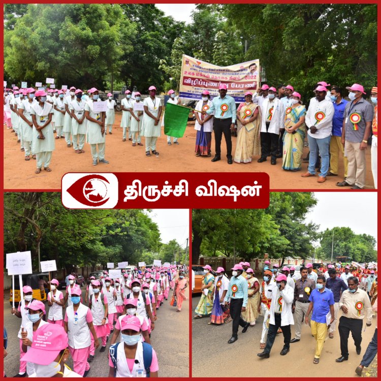 இதன் ஒருபகுதியாக திருச்சி மத்திய பேருந்துநிலையம் அருகே உள்ள வெஸ்ட்ரி பள்ளி மைதானத்திலிருந்து 300க்கும் மேற்பட்ட செவிலியர் பயிற்சி மாணவிகள் மற்றும் கல்லூரி மாணவிகள் கலந்துக்கொண்ட மக்கள் நல்வாழ்வு மற்றும் குடும்ப நலத்துறை சார்பில் விழிப்புணர்வு பேரணி இன்று நடைபெற்றது.