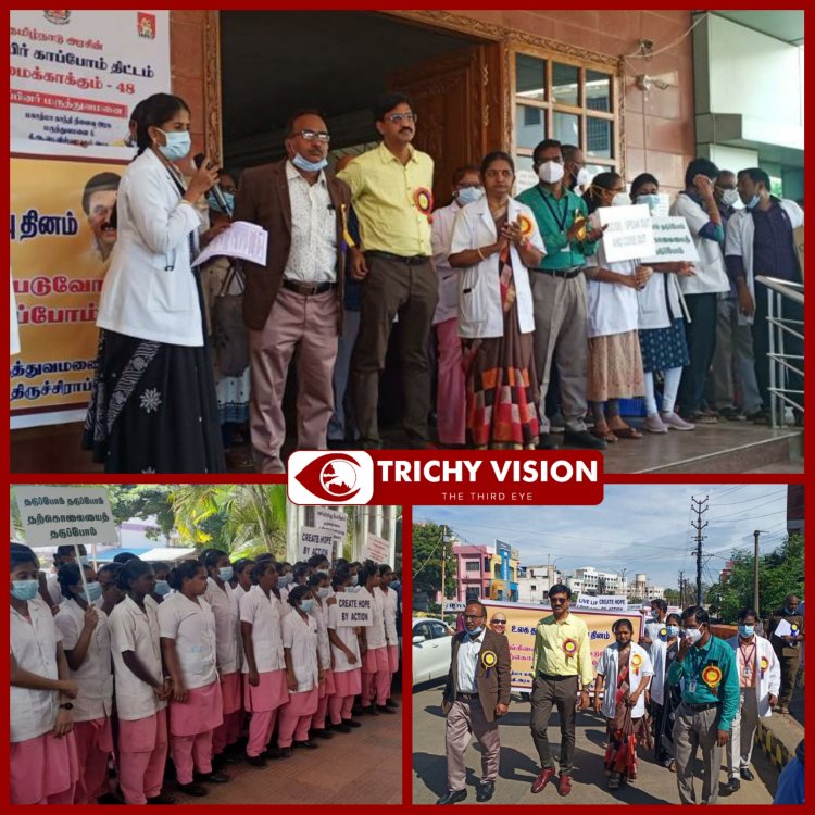 திருச்சிராப்பள்ளி மகாத்மா காந்தி நினைவு அரசு மருத்துவமனையில் உலக தற்கொலை தடுப்பு தினத்தை முன்னிட்டு தற்கொலையை தடுப்பது பற்றிய விழிப்புணர்வு பேரணி (9.9.2022) இன்று நடைபெற்றது. பேரணியை முதல்வர் டாக்டர் நேரு கொடியசைத்து தொடங்கி வைத்தார் .மருத்துவ மாணவர்கள், செவிலிய மாணவர்கள் ,மருத்துவம் சார்ந்த படிப்பு மாணவர்கள் மருத்துவர்கள் பேரணியில் பங்கேற்றனர்.