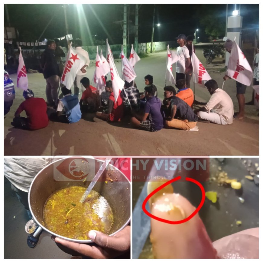 இந்த நிலையில் நேற்று இரவு விடுதியில் வழங்கப்பட்ட உணவில் புழு இருந்துள்ளது. இதனால் கொதித்து எழுந்த மாணவர்கள் உடனடியாக இந்திய மாணவர் சங்க மாநில நிர்வாகி மோகனுக்கு தகவல் கொடுத்துள்ளனர். அதன் அடிப்படையில் அங்கு விரைந்து சென்ற மோகன் தலைமையிலான இந்திய மாணவர் சங்கத்தினர் விடுதி நிர்வாகத்தின் அலட்சிய போக்கை கண்டித்து திருச்சி – தஞ்சை தேசிய நெடுஞ்சாலையில் விடுதி மாணவர்களுடன் சாலை மறியல் போராட்டத்தில் ஈடுபட்டனர்.