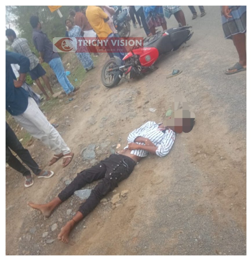 பெரம்பலூர் மாவட்டம் செஞ்சேரி அண்ணாசாலை தெருவைச் சேர்ந்தவர் சக்திவேல். இவரது மகன் நவீன் (21). இந்திரா நகரை சேர்ந்த தமிழ்வாணன் (21) மற்றும் சச்சின் ஆகிய மூவரும் மோட்டார் பைக்கில் திருச்சியில் இருந்து செஞ்சேரி நோக்கி திருச்சி – சென்னை தேசிய நெடுஞ்சாலையில் சென்று கொண்டிருதனர்.