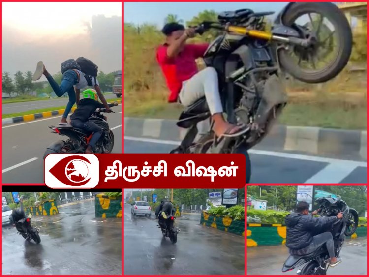 திருச்சி மாநகர், மாவட்ட சாலைகளில் தினமும் சில இளைஞர்கள் இருசக்கர வாகனத்தில் சாகசம் செய்து வருவது வழக்கமாகிவிட்டது. இதில் விலை உயர்ந்த இருசக்கர வாகனத்தை ஓட்டும் அந்த இளைஞர் தாறுமாறான வேகத்தில் செல்வதுடன் முன் சக்கரத்தை தூக்கிக்கொண்டு, வாகனத்தை ஓட்டுகிறார்.