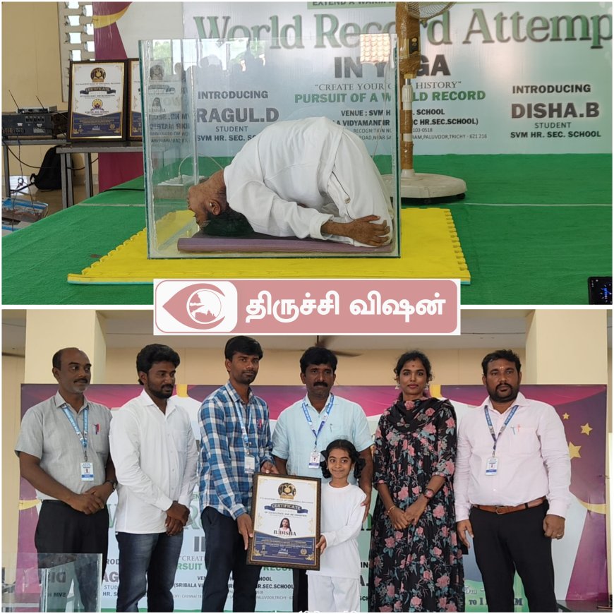திருச்சி சமயபுரம் அருகே பழூரில் இயங்கி எஸ்.வி.எம் மெட்ரிக் மேல்நிலைப்பள்ளியில் மாஸ்ட்ரி உலக சாதனை புத்தகத்தில் இடைபெறும் வகையில் யோகா உலக சாதனை நிகழ்ச்சி நடைபெற்றது.இதில் பள்ளியில் நான்காம் வகுப்பு பயிலும் மாணவி திஷா (9) என்ற நான்காம் வகுப்பு மாணவி கண்ணாடி பேழைக்குள் தொடர்ந்து 20நிமிடம் 30 வினாடிகள் உஷ்ட்ராசனா யோகாவை செய்து உலக சாதனை படைத்தார்.